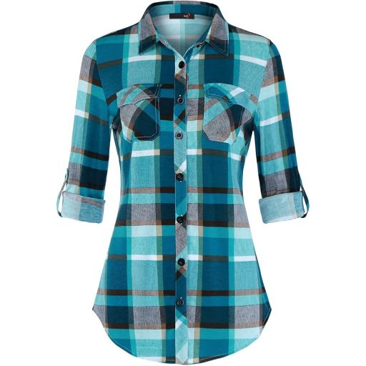 If you’re after a plaid shirt that feels more like your favorite tee than a stiff flannel, this stretchy knit blouse from DJT delivers comfort without compromise. Designed with a collared button-down front, roll-up sleeves, and a slightly tailored fit, it’s a fresh, form-flattering twist on traditional plaid shirts for women. Ideal for layering or wearing solo, this piece blends versatility and softness in one easygoing design.