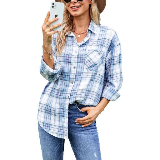 Blending casual charm with a hint of stretch, this boyfriend-style plaid shirt from Oyamiki is made for relaxed, everyday comfort. With its classic check pattern and flattering silhouette, it delivers an easygoing yet pulled-together look. Though it gives off flannel vibes, the fabric is actually a soft cotton-spandex blend, perfect for those who love the look of plaid shirts for women without the bulk of true flannel.